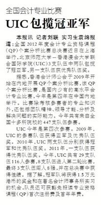 本报讯 记者刘联 实习生袁绵报道:全国2012年度会计专业资格课程(QP)个案分析比赛总决赛近日在上海举行,北京师范大学-香港浸会大学联合国际学院(UIC)3支队伍中两队包揽了冠亚军,另一支队伍获优秀队伍奖。