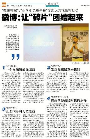 近日,“微博打拐”、“中国贫困山区小学生免费午餐”的发起人邓飞,应邀做客北京师范大学—香港浸会大学联合国际学院(UIC),与学子们面对面,讲述他的微公益故事及亲身经历。