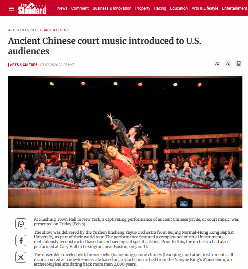 The show was delivered by the Yuzhen Jinsheng Yayue Orchestra from Beijing Normal-Hong Kong Baptist University, as part of their world tour. The performance featured a complete set of ritual instruments, meticulously reconstructed based on archaeological specifications. Prior to this, the orchestra had also performed at Cary Hall in Lexington, near Boston, on Jan. 31.