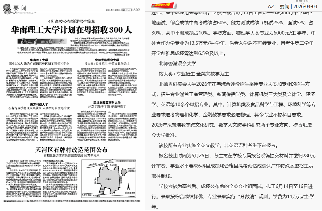 昨日,广东省教育考试院发布华南理工大学、南方科技大学、北师香港浸会大学、深圳北理莫斯科大学4所高校在粤综合评价招生简章。