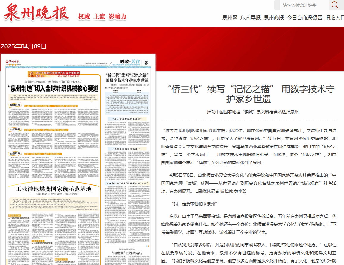 庄以仁出生于马来西亚槟城,是泉州台商投资区华侨后裔。五年前在泉州寻根成功之后,他始终想着为家乡做点什么。此次他还有一个身份:北师香港浸会大学文化与创意学院院长,手下带着影视学、动画与互动媒体、游戏设计三个专业的学生。