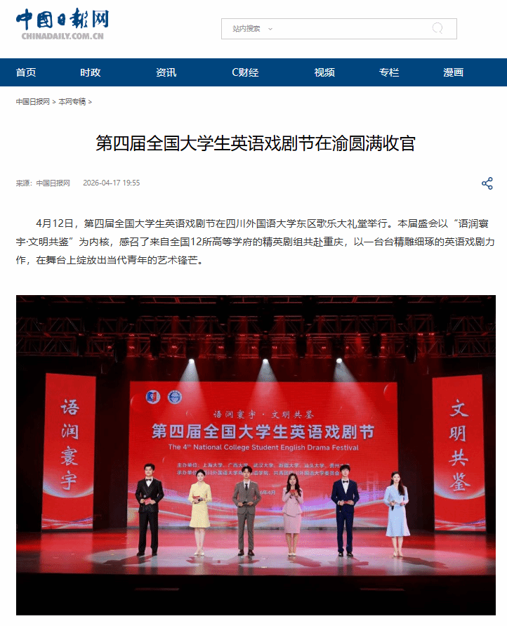 赛后点评环节,评审专家团对展演目给予了高度评价,并就表演艺术的进阶之道为学子们提供了宝贵建议。英语戏剧作为一种综合性的跨文化载体,在打磨语言功底的同时,更在锻造团队之魂与创新思维。本届戏剧节的圆满举办,再度为全国青年筑起了一座思想共鸣与才华释放的桥梁,有力推动了英语从工具属性向文化载体升华,持续擦亮了具有全国口碑的高校美育品牌。