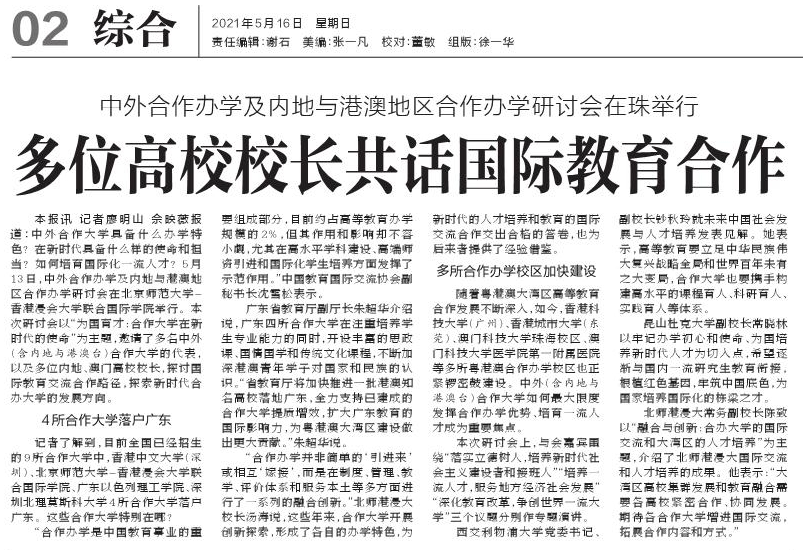 “合作办学并非简单的‘引进来’或相互‘嫁接’,而是在制度、管理、教学、评价体系和服务本土等多方面进行了一系列的融合创新。”北师港浸大校长汤涛说,这些年来,合作大学开展创新探索,形成了各自的办学特色,为新时代的人才培养和教育的国际交流合作交出合格的答卷,也为后来者提供了经验借鉴。