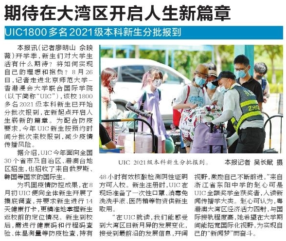 本报讯(记者廖明山佘映薇)开学季,新生们对大学生活有什么期待?将如何实现自己的理想和抱负?8月26日,记者走进北京师范大学-香港浸会大学联合国际学院(以下简称“UIC”),该校1800多名2021级本科新生已开始分批次报到,在新起点开启人生崭新的篇章。为配合防疫要求,今年UIC新生按预约时间分批次来校报到,减少疫情传播风险。