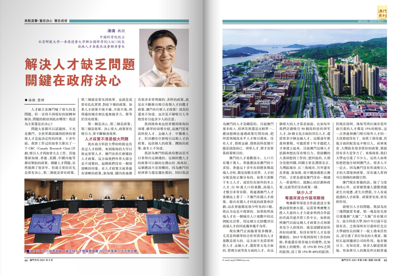 粤澳横琴深度合作区建设方案应该很快会出台,这需要粤澳双方投入大量的人才力量参与到合作区的共商共建共管工作中去,如果按照澳门目前这种人才政策方式和节奏是令人担忧的。就是说国家给你再好的政策,你没有领军人才是很难做的。2015年我到深圳工作的时候,香港还有很多地方的优势,比如税收上的优势,有15%和35%之间的区别,高工资15%和40%的区别。但现在深圳、珠海等湾区城市从外面引进的人才都是15%的税收,这一点香港和澳门吸引海外人才的一大优势就没有了。如果工资待遇、其他方面的配套也不吸引人,而广东省、大湾区有很多更好的政策,那就没有多大竞争力了。来珠海后,我们大学也引进了不少人,这些人如果你想把他介绍到澳门去,很多人不一定去,因为澳门没有形成吸引人才的大环境和政策,没有让人看到可以发挥的广阔空间。