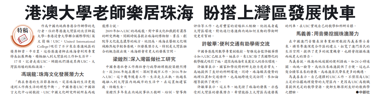 「與在香港的生活節奏相比,定居珠海的生活更能達到工作與生活的理想平衡。」中國香港UIC中國語言文化中心副教授、UIC中國文化研究所副所長馮瑞龍博士說。