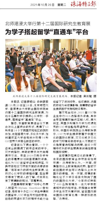 本报讯记者廖明山佘映薇报道:10月20日至24日,北京师范大学-香港浸会大学联合国际学院举行第十二届国际研究生教育展,为近千名高校学子提供心仪学校一手信息,搭起留学“直通车”平台。