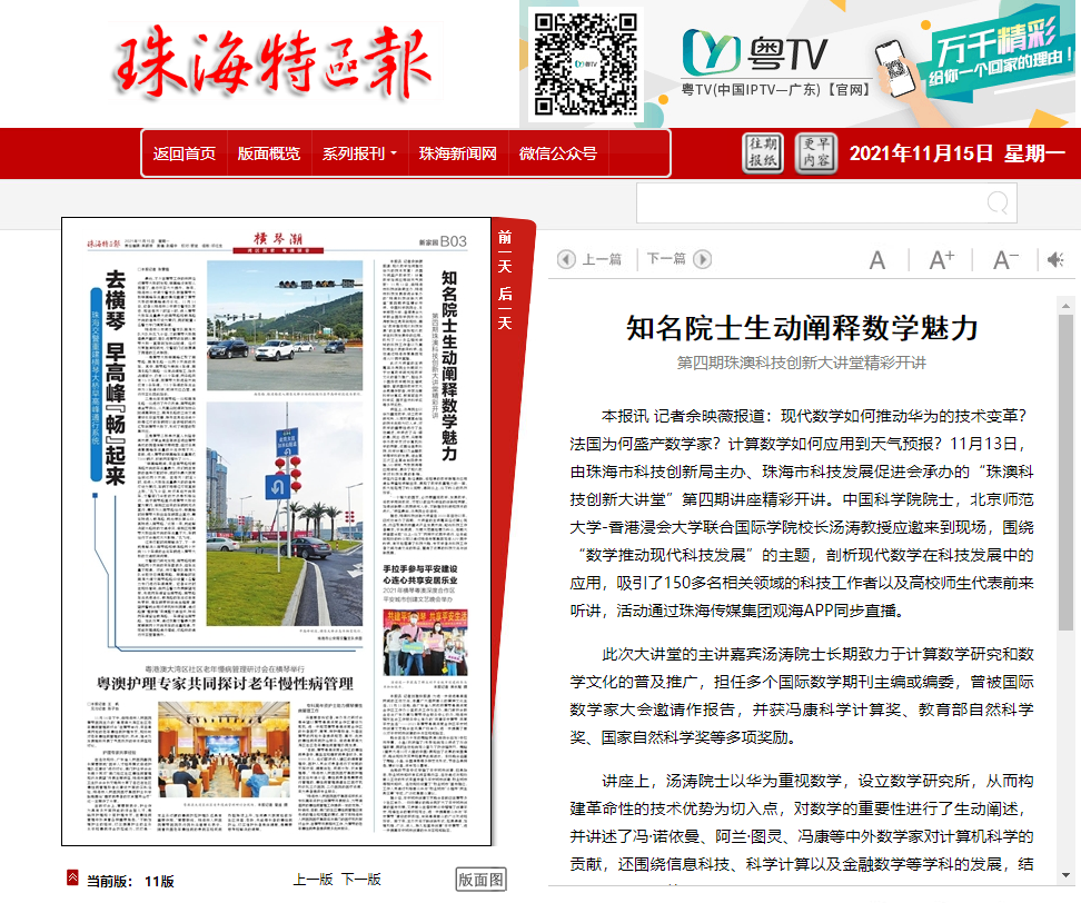 本报讯记者佘映薇报道:现代数学如何推动华为的技术变革?法国为何盛产数学家?计算数学如何应用到天气预报?11月13日,由珠海市科技创新局主办、珠海市科技发展促进会承办的“珠澳科技创新大讲堂”第四期讲座精彩开讲。中国科学院院士,北京师范大学-香港浸会大学联合国际学院校长汤涛教授应邀来到现场,围绕“数学推动现代科技发展”的主题,剖析现代数学在科技发展中的应用,吸引了150多名相关领域的科技工作者以及高校师生代表前来听讲,活动通过珠海传媒集团观海APP同步直播。