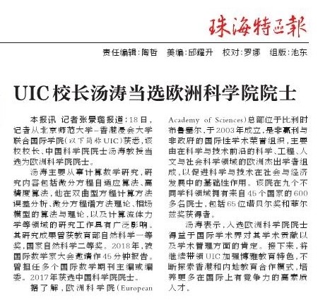本报讯 记者张景璐报道:18日,记者从北京师范大学-香港浸会大学联合国际学院(以下简称UIC)获悉,该校校长、中国科学院院士汤涛教授当选为欧洲科学院院士。