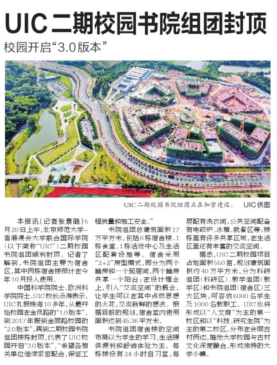 2022.5.22[珠江晚报]--UIC二期校园书院组团封顶 校园开启“3.0版本”