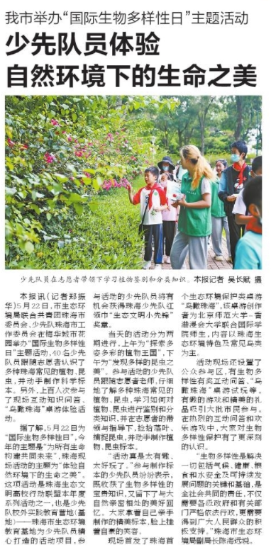 据了解,5月22日为“国际生物多样性日”,今年的主题是“为所有生命构建共同未来”,珠海现场活动的主题为“体验自然环境下的生命之美”。这项活动是珠海生态文明高校行动联盟本年度系列活动之一,也是少先队校外实践教育营地(基地)——珠海市生态环境教育基地为少先队员精心打造的活动项目,参与活动的少先队员将有机会获得珠海少先队红领巾“生态文明小先锋”奖章。