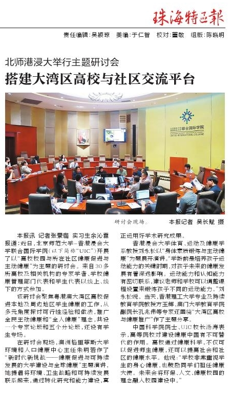 本报讯 记者张景璐 实习生余沁霖报道:近日,北京师范大学-香港浸会大学联合国际学院(以下简称“UIC”)开展了以“高校校园与所在社区健康促进与主动健康”为主题的研讨会。来自30多所高校及相关机构的专家学者、学校健康管理部门代表和学生代表以线上、线下的方式参加。