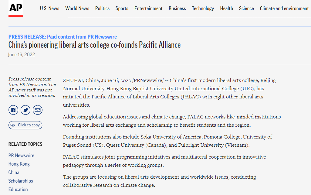 ZHUHAI, China, June 16, 2022 /PRNewswire/ -- China’s first modern liberal arts college, Beijing Normal University-Hong Kong Baptist University United International College (UIC), has initiated the Pacific Alliance of Liberal Arts Colleges (PALAC) with eight other liberal arts universities.
