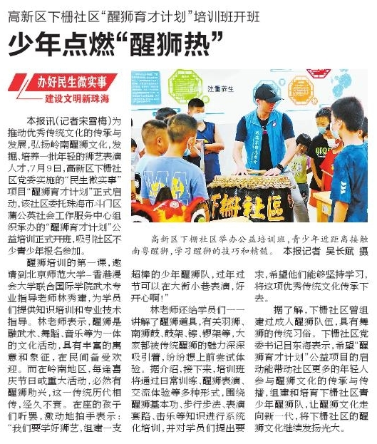本报讯(记者宋雪梅)为推动优秀传统文化的传承与发展,弘扬岭南醒狮文化,发掘、培养一批年轻的狮艺表演人才,7月9日,高新区下栅社区党委实施的“民生微实事”项目“醒狮育才计划”正式启动,该社区委托珠海市斗门区蒲公英社会工作服务中心组织承办的“醒狮育才计划”公益培训正式开班,吸引社区不少青少年报名参加。