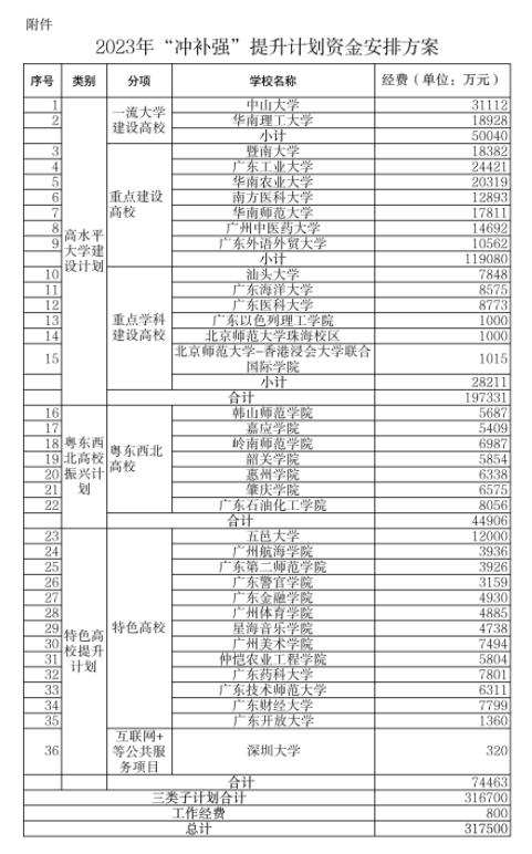 10月27日,广东省教育厅公示了广东2023年高等教育“冲一流、补短板、强特色”提升计划资金安排方案。此举旨在切实解决广东高等教育发展不平衡不充分问题,增强高校服务创新驱动发展战略的能力,加快高等教育内涵式发展。公示期为10月27日至11月2日。