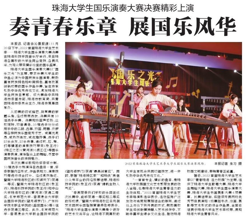本报讯 记者余沁霖报道:11月20日下午,2022首届珠海大学生艺术季——珠海大学生国乐演奏大赛决赛在珠海科技学院音乐厅举行,来自珠海各高校的大学生同台竞技、各展风采,为观众带来精彩纷呈的国乐盛宴。