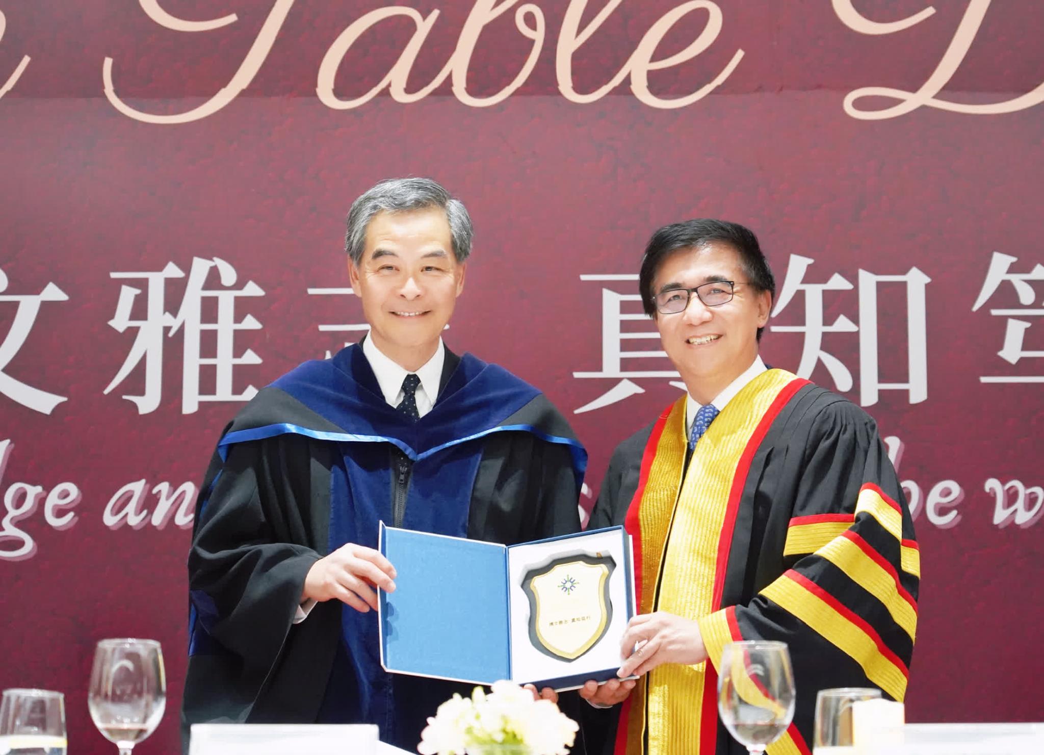 梁振英在北師港浸大高桌晚宴上發表主題演講。(受訪者供圖)