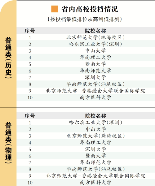 在普通类(历史),华南农业大学、广州医科大学被挤出前十,深圳大学、北京师范大学-香港浸会大学联合国际学院强势进入这一梯队,分列第七、第九位,南方医科大学从去年的第八下降到第十。四至六位格局保持不变,分别是华南理工大学、暨南大学、华南师范大学。去年的第三名北京师范大学(珠海校区)直接冲到榜首,取代了中山大学的位置。哈尔滨工业大学(深圳)稳居第二。