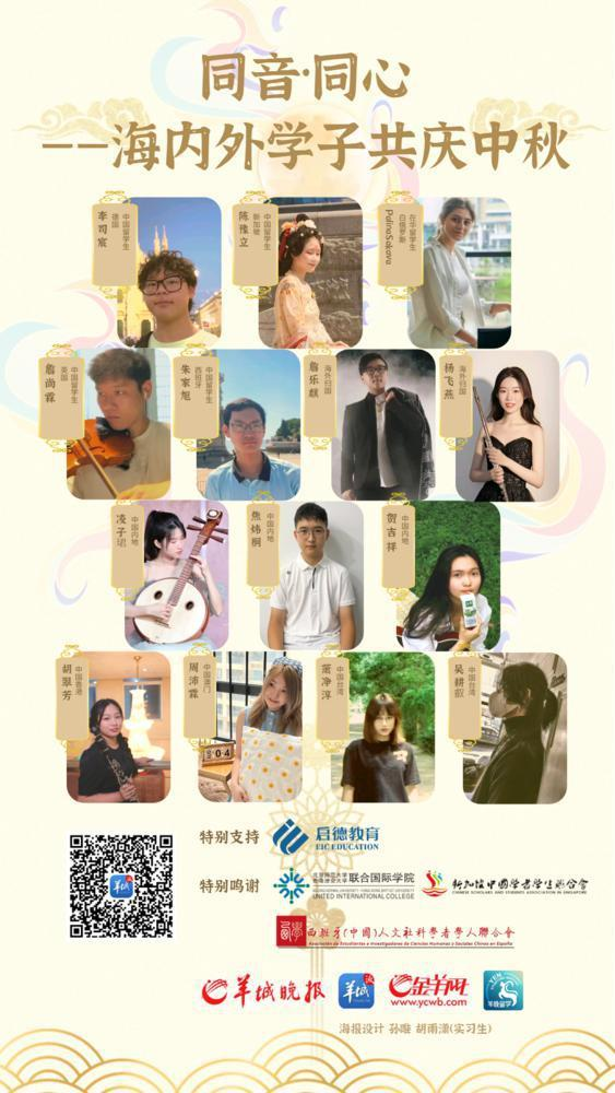 在这个特别的时刻,羊城晚报推出特别节目,邀请在英国、德国、新加坡、西班牙求学的中国留学生,中国内地(大陆)学生,中国香港、中国澳门、中国台湾学生,海外留学归国学生,白俄罗斯在华留学生,用不同的乐器,共同奏响中国传统名曲《彩云追月》。