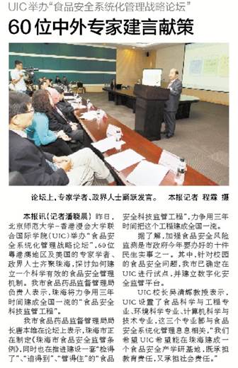 本报讯(记者潘晓晨) 昨日,北京师范大学-香港浸会大学联合国际学院(UIC)举办“食品安全系统化管理战略论坛”,60位粤港澳地区及美国的专家学者、政界人士齐聚珠海,探讨如何建立一个科学有效的食品安全管理机制。我市食品药品监督管理局负责人表示,珠海将力争用三年时间建成全国一流的“食品安全科技监管工程”。