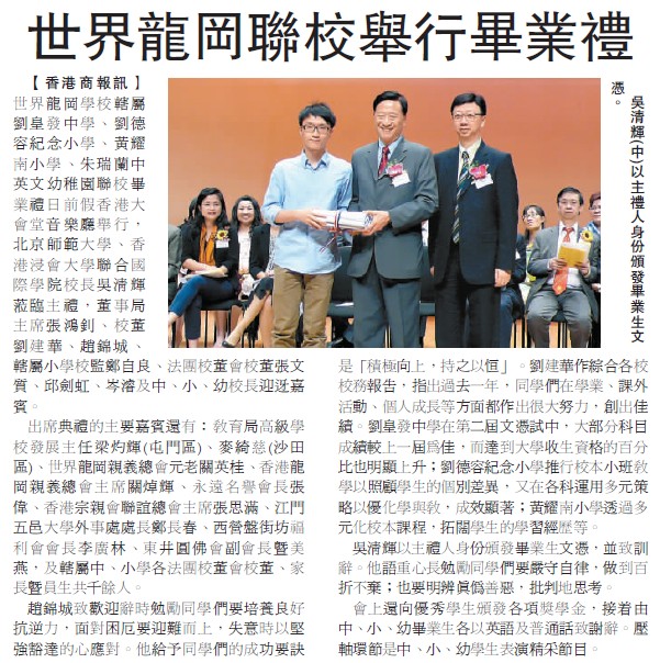 【香港商报讯】世界龙冈学校辖属刘皇发中学、刘德容纪念小学、黄耀南小学、朱瑞兰中英文幼稚园联校毕业礼日前假香港大会堂音乐厅举行,北京师范大学、香港浸会大学联合国际学院校长吴清辉莅临主礼,董事局主席张鸿钊、校董刘建华、赵锦城、辖属小学校监郑自良、法团校董会校董张文质、邱剑虹、岑潈及中、小、幼校长迎迓嘉宾。