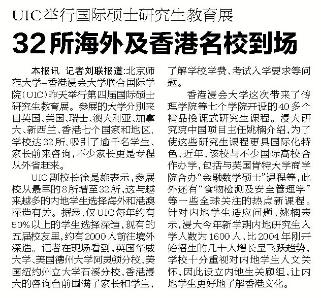 本报讯 记者刘联报道:北京师范大学-香港浸会大学联合国际学院(UIC)昨天举行第四届国际硕士研究生教育展。参展的大学分别来自英国、美国、瑞士、澳大利亚、加拿大、新西兰、香港七个国家和地区,学校达32所,吸引了逾千名学生、家长前来咨询,不少家长更是专程从外省赶来。