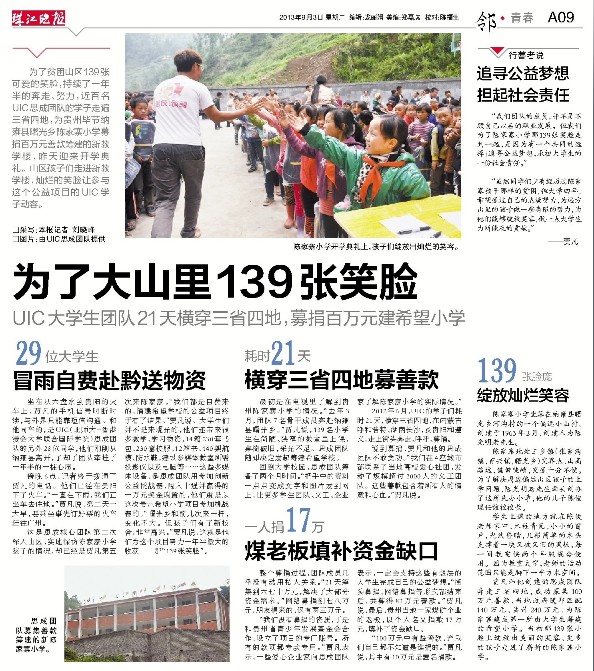为了贫困山区139张可爱的笑脸,持续了一年半的奔走、努力,近百名UIC思成团队的学子走遍三省四地,为贵州毕节纳雍县曙光乡陈家寨小学募捐百万元善款筹建的新教学楼,昨天迎来开学典礼。山区孩子们走进新教学楼,灿烂的笑脸让参与这个公益项目的UIC学子动容。