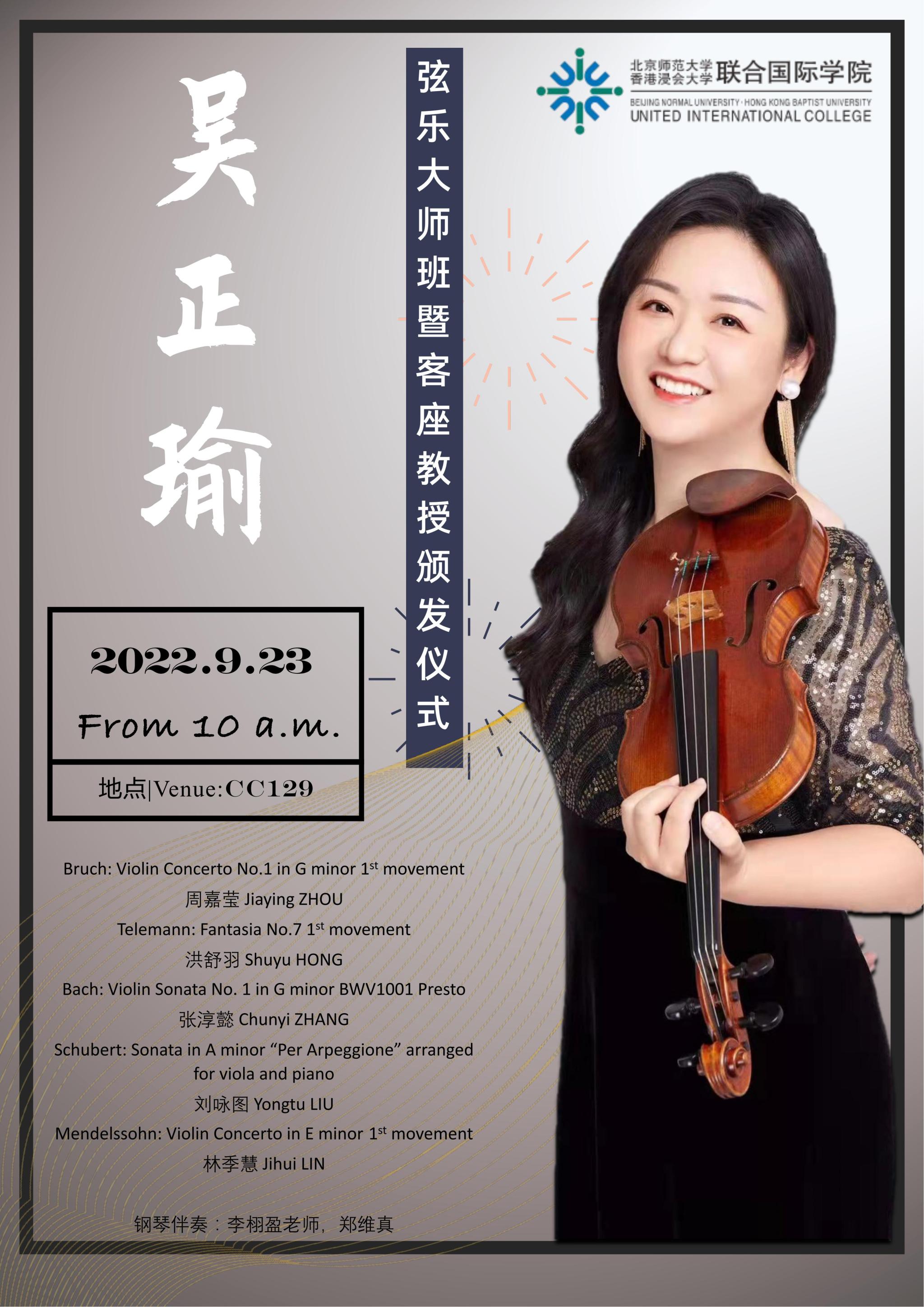 Bio of the Speaker: Learning from Zhonghua SHENG, Jiyang ZHAO, Zhinuo DING, Ivry Gitlis, Zakhar Bron. Ms.Zhengyu WU is former concertmaster of the Shanghai Philharmonic Orchestra and former Guest Concertmaster of the BBC Philharmonic Orchestra (2010). Bachelor's degree of Shanghai Conservatory of Music, winner of Golden Bell Award, winner of Fu Chengxian Scholarship. Master's degree of the Royal Northern Conservatory of Music, Winner of the Royal College of Music Joint Board A and other full scholarship recipients for two consecutive years.