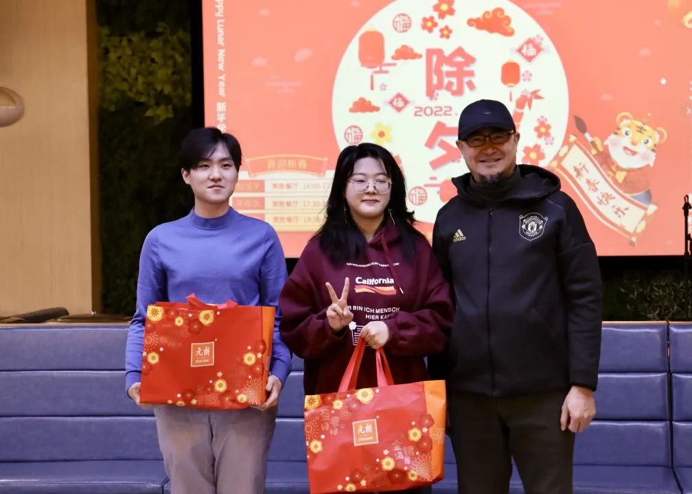 席间,师生开心畅聊,有同学自发表演助兴,还有抽奖活动,欢乐不断。吃过年夜饭,同学们一起看春晚,玩小游戏,其乐融融。